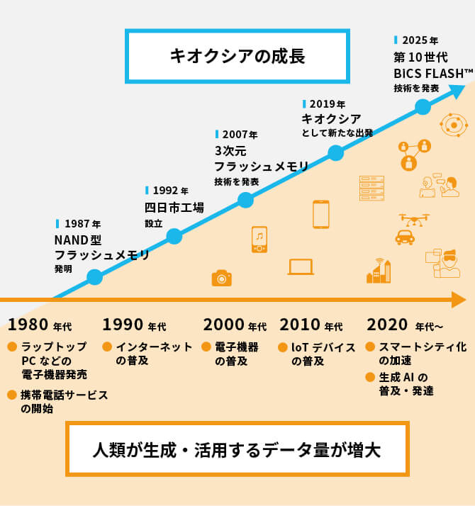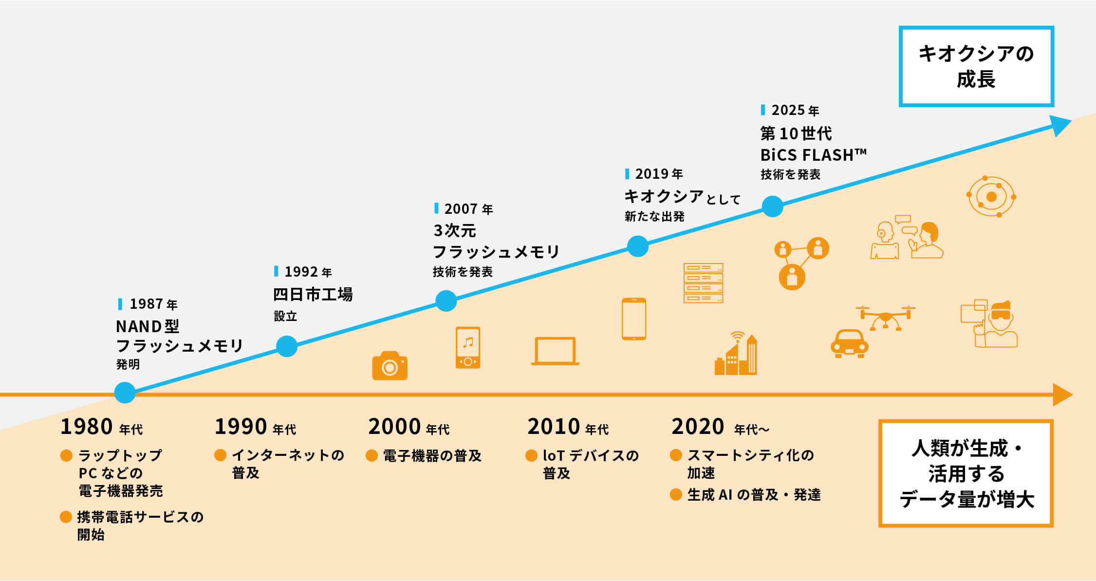 キオクシアは、40年近くにわたりフラッシュメモリにおける先端技術の開発を重ね、常に技術の転換点をつくり出してきました。