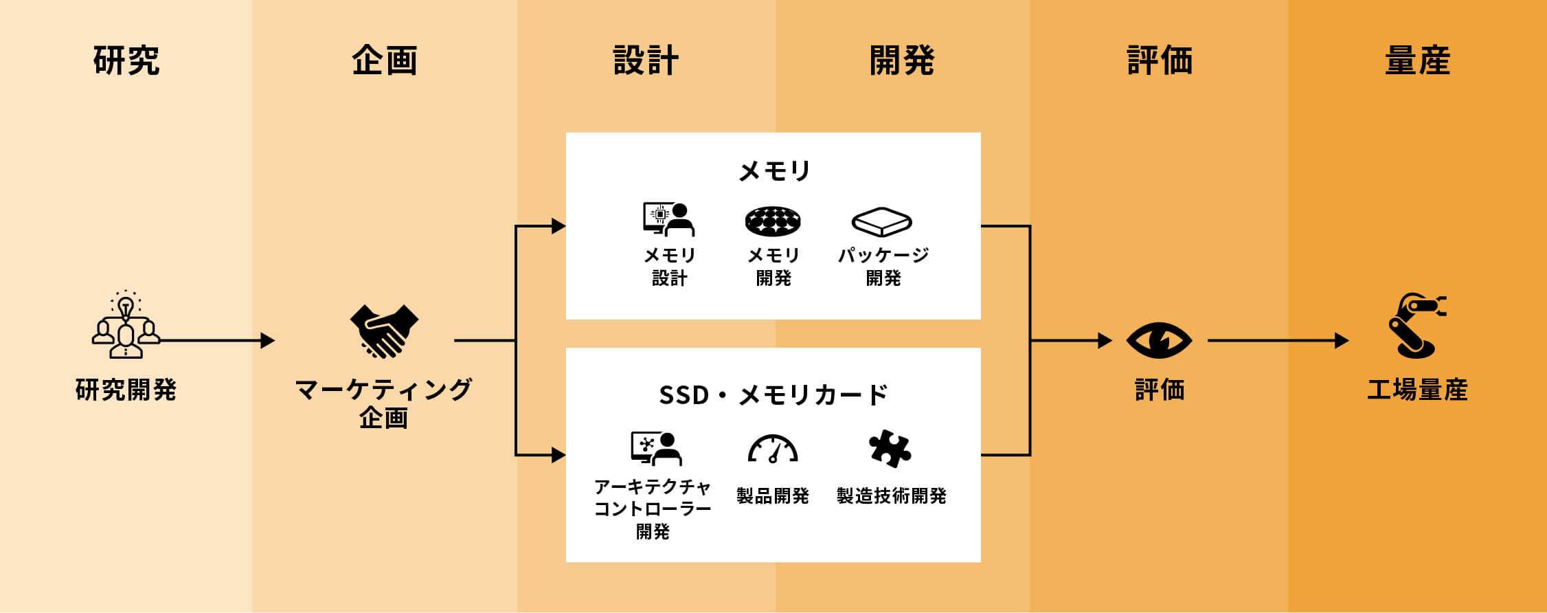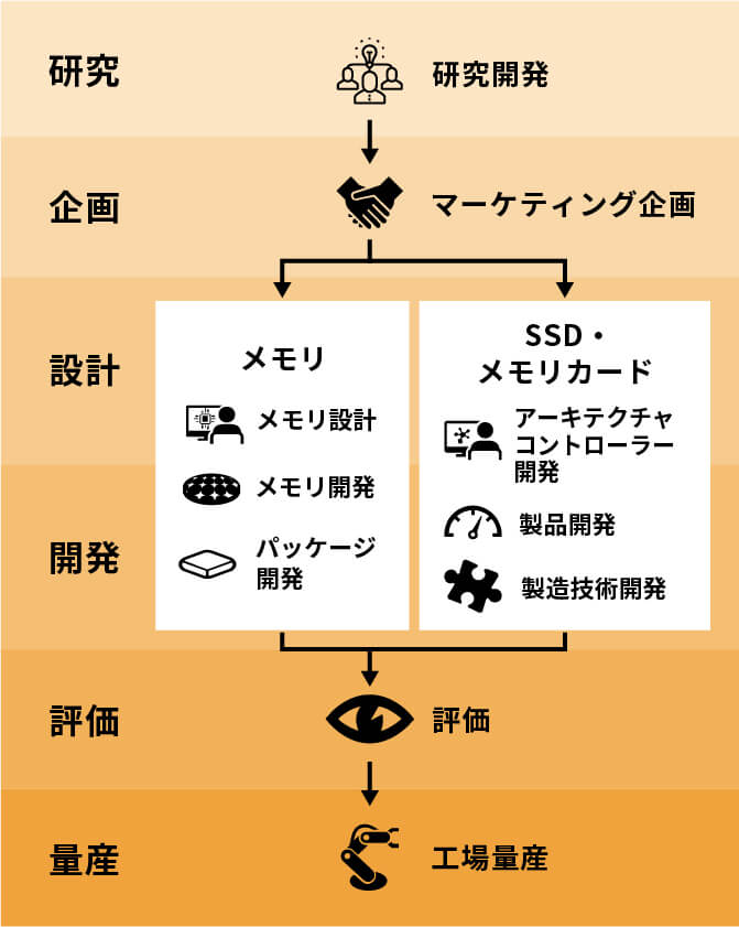 進化するAI需要に応えながら、顧客の多様なニーズに基づき高密度化・大容量化のソリューションを展開しています。3次元フラッシュメモリの設計とパッケージ設計に加え、評価・信頼性技術の開発を担当。また、UFSやeMMCなどの組込メモリ、SDメモリカード/USBフラッシュメモリといったメモリ製品の技術開発も牽引。コントローラーHW(ハードウェア)やFW(ファームウェア)設計・評価・量産まで一貫してアプローチしています。